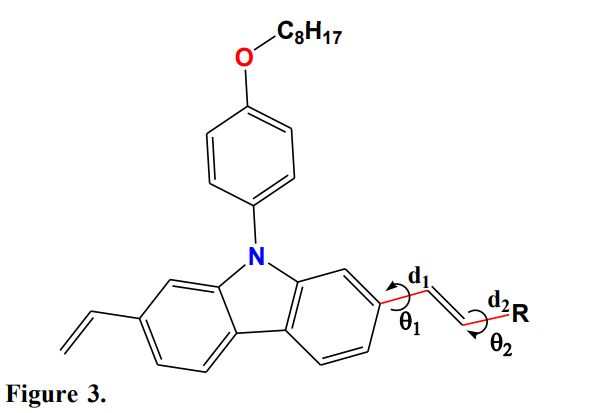 Note that the distances d. and d. represent, respectively, the charge transfer bridge between the donor part (D) and the spacer (vinyl) with the groups R, and q. and q. are the dihedral angles between the donor (D) and the spacer on the one hand and the groups R and the spacer on the other hand (Fig. 3). The values obtained from the optimization are grouped in Tab. 1.