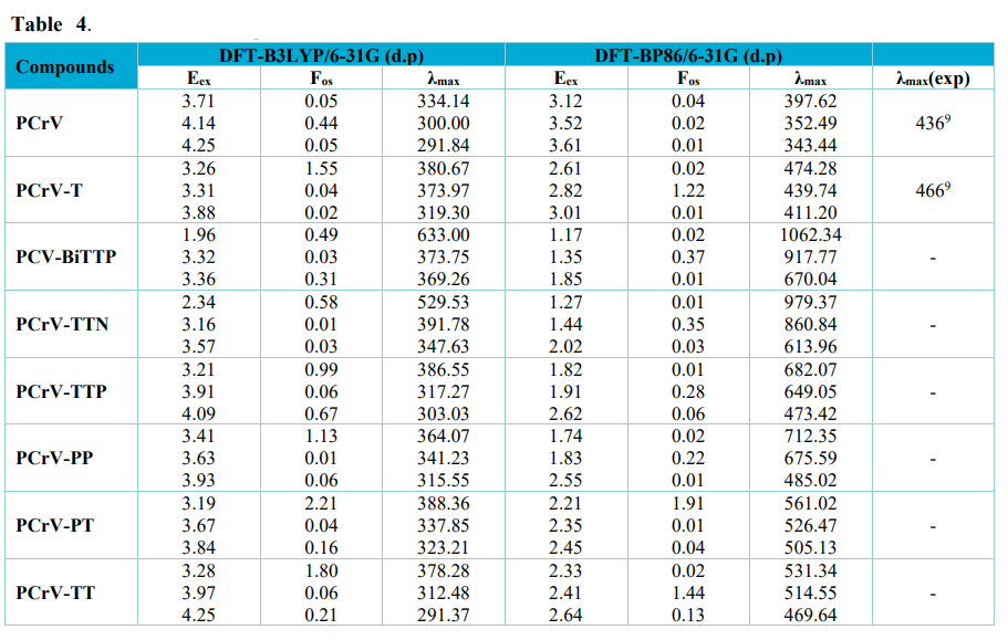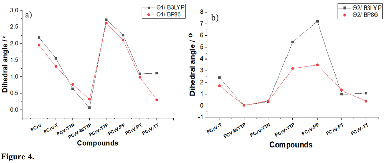 It is noticed that the dihedral angle q. between the electron donor groups and the spacer for all compounds varies between 0.5 and 2.75°. Regardless of the study functional (B3LYP and BP86) except the dihedral angle of the PCrV-BiTTP oligomer for both functionals (0.01° for the B3LYP functional and 0.35° for the BP86 functional), i.e., the PCrV-BiTTP oligomer is almost coplanar, when the geometries are optimized by the B3LYP functional. On the other hand, for both functionals (B3LYP and BP86) the values of the dihedral angle q. between the spacer and the R groups for the PCrV-BiTTP oligomer is 0.02° for B3LYP and 0.03 for BP86. The values of the other oligomers show that the compounds studied have a noncoplanar structure especially for compounds having the PP, TTP, PT groups, this is probably due to the steric effect of the R groups.