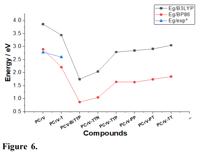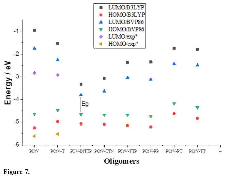 The theoretical knowledge of the HOMO and LUMO energy levels of the components is fundamental for the study of organic solar cells. Electronic properties are of paramount importance for the study of this type of molecules. Among these properties, it is mentioned the LUMO, HOMO levels, and the energy gap (Davidson et al., 1984; Jabha and Abdellah, 2018; Kato et al., 2014; 2015), the latter being one of the most important factors in the control of physical and photovoltaic properties. The theoretical and experimental gap energy values of the PCrV and PCrV-T oligomers were compared, which are, respectively, 2.78 and 2.6 eV (Leclerc et al., 2006) (Fig. 6).