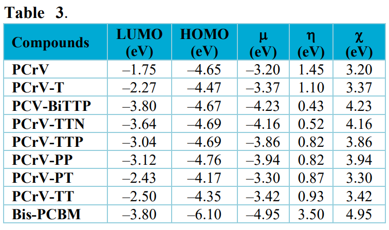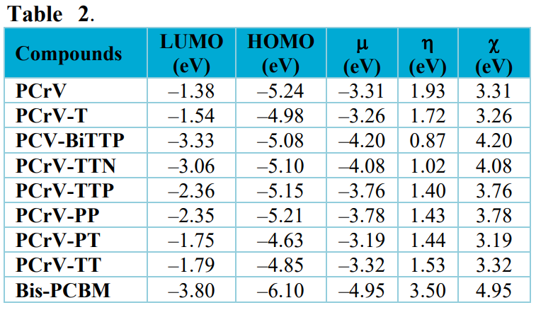 [Eq. 3]In Tabs. 2 and 3, the electronic and chemical parameters obtained from the optimized structures are presented, namely: HOMO and LUMO energies, chemical potential, overall hardness and electronegativity of the compounds (PCrV-R) and the Bis-PCBM acceptor. From these results (Tabs. 2 and 3), it can be seen that the Bis-PCBM compound has the lowest chemical potential value (–4.95 eV) compared to the other compounds.