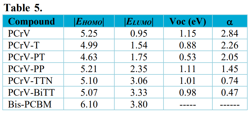 The theoretical values of the open circuit voltage (Voc) of the studied molecules range from 0.53 to 1.15 eV taking as acceptor semiconductor the Bis-PCBM within the solar cell. The molecules PCrV, PCrV-PP, PCrV-TTN and PCrV-BiTT have high VOC values and low gaps, as well as small α values allowing the passage of electrons from the donor LUMO to the acceptor LUMO, especially for the PCrV-BiTT molecule (α = 0.47), with a good position of HOMO compared to that of Bis-PCBM. These arguments make these molecules good and promising candidates for photovoltaic applications.