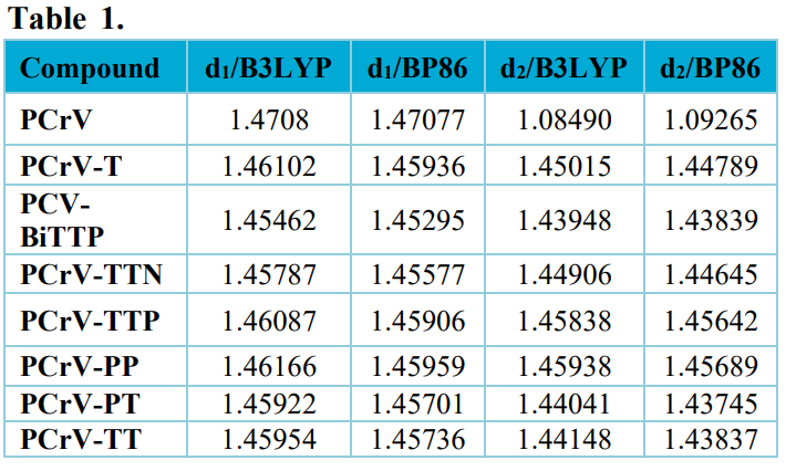According to Tab. 1, it is possible to observe that the values of the bonds obtained from the calculations do not undergo a great change, generally the lengths are close to that of carbon-carbon (1.48 Å). In resonance, especially the values obtained by the B3LYP functional, the d2 bond (Fig. 3) of the PCrV oligomer is a C–H single bond, and the closest value to the experimental one is that obtained by the B3LYP functional.