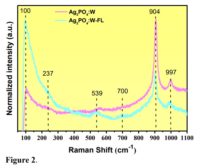 Figure 2 shows the Raman spectra of Ag3PO4:W and Ag3PO4:W-FL samples. According to the group theory analysis, the cubic phase of Ag3PO4 structure presents 18 Raman active modes (Γ = 2 A1 + 4 E + 12 T2) (Trench et al., 2018; Botelho et al., 2015). The observed Raman bands for the prepared samples are located at approximately 100, 237, 539, 700, 904, and 997 cm–1. All these modes are related to the cubic phase of Ag3PO4 and no Raman bands related to any secondary or W dopant phases were observed. The bands located at 100 and 237 cm–1 have been assigned to the translational and/or rotational modes with T2 symmetry of [PO4] clusters. The band located at 539 cm–1 is assigned to the bending mode with T2 symmetry of [PO4] clusters. The band located at 700 cm–1 is attributed to the symmetric stretching mode of the [PO4] clusters. The most intense band located at 904 cm–1 is related to the symmetric stretching (A1) mode, whereas the band located at 997 cm–1 is related to the asymmetric stretching mode (T2) mode of [PO4] clusters.
