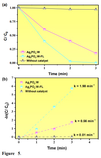 The photocatalytic activity of the Ag3PO4:W and Ag3PO4:W-FL samples were investigated by the degradation of RhB under visible light irradiation. Figure 5a shows the degradation efficiency of both prepared samples and the control experiment without photocatalyst. As can be seen, no significant degradation was observed in the absence of photocatalyst. As previously reported, the Ag3PO4:W sample presents a highly photocatalytic activity for RhB degradation under visible light irradiation, allowing approximately 82.5% of RhB degradation in only 3 min of reaction (Trench et al., 2020). However, it was observed a remarkable improvement of the photocatalytic activity of the FL irradiated sample, allowing 100% of RhB degradation in 3 min of reaction. To further compare, the Ag3PO4:W and Ag3PO4:W-FL samples promoted 60.5% and 97.2% of RhB in only 2 min of reaction. Figure 5b shows the Langmuir-Hinshelwood plot for the pseudo first-order kinetics model (B. Liu et al., 2014) for both prepared samples and the control experiment. It was observed that the Ag3PO4:W-FL sample presented a rate constant (k) 3.54 times higher than the Ag3PO4:W sample.
