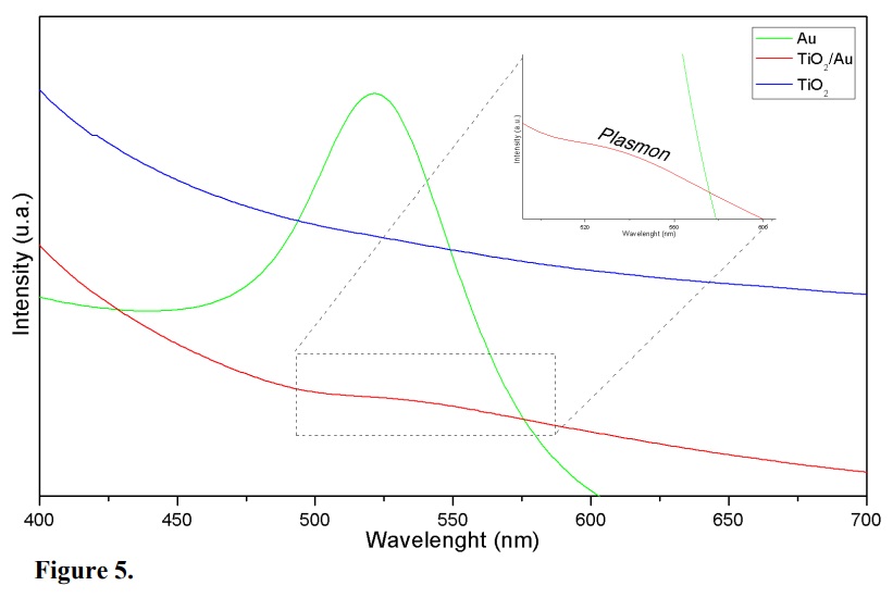 The presence of gold nanoparticles coating the surface of titanium oxide nanoparticles was also verified by UV-Vis spectroscopy showing the Au nanoparticles the plasmon band at 550 nm. The presence of the plasmon band characteristic of gold in TiO2/Au nanoparticles contributes to the characterization of the material (Verma et al., 2020). This band formation can be seen in Fig. 5.
