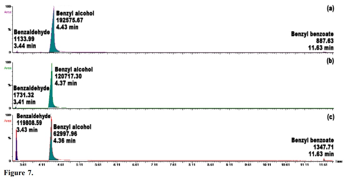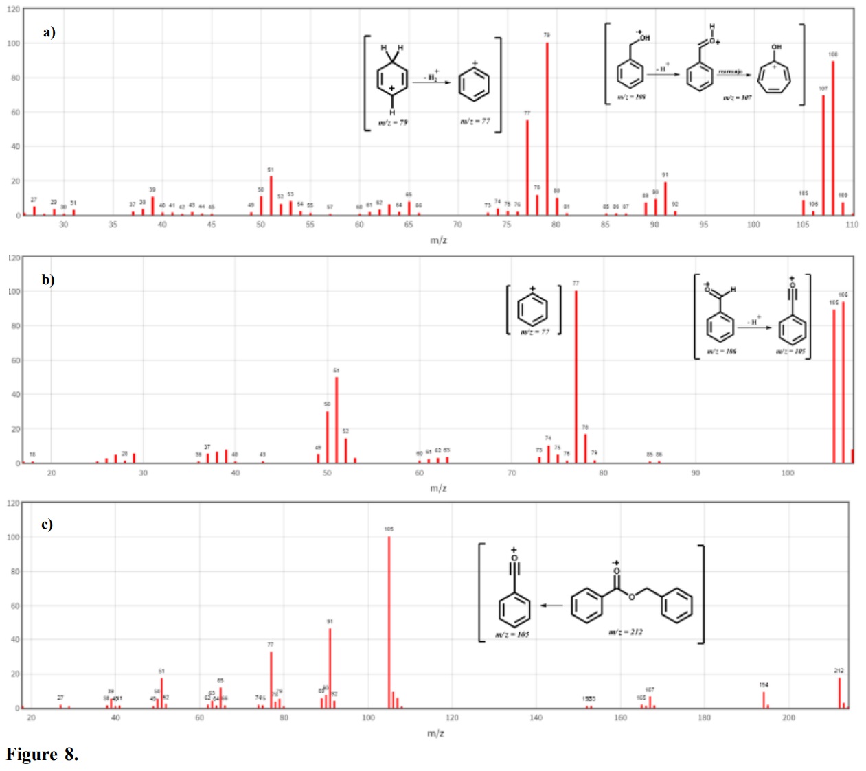 In addition, the mass spectrum of the species was also analyzed. Figure 8a shows the mass spectra of benzyl alcohol, as well as its characteristic fragmentation, showing peaks in m/z 108, 107, 91, 79, 77 and 51, which, according to the literature and the equipment’s database, characterize the benzyl alcohol. Figure 8b shows the mass spectrum and characteristic fragmentation of benzaldehyde, the peaks at m/z 106, 105, 77, 51 and 50 are also in accordance with the literature and characterize benzaldehyde. Figure 8c shows the mass spectrum and characteristic fragmentation of benzyl benzoate, whose peaks at 212, 105, 91 and 77 characterize benzyl benzoate.