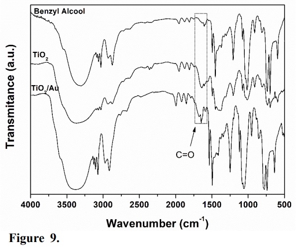 Titanium oxide nanoparticles and gold doped titanium oxide nanoparticles were characterized by X-ray diffraction (XRD), UV-visible spectroscopy and infrared spectroscopy (UV-Vis). All nanoparticles’ catalytic activity was investigated in the benzyl alcohol oxidation reaction and followed by infrared spectroscopy and gas chromatography coupled to mass spectrometer (GC-MS).