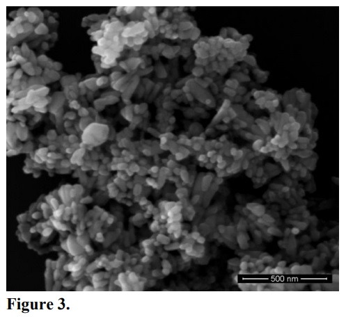 Transmission electron microscopy (TEM) images were able to confirm the average size 32 nm at length and show rod shape morphology, as seen in the Fig. 2. Figure 3 shows a scanning electron microscopy (SEM) image of the TiO2 nanoparticles, which shows a uniform distribution of the nanomaterial.