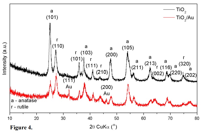 TiO2 nanoparticles modified with gold (TiO2/Au) were also analyzed by XRD, whose diffractogram is shown in Fig. 4. The presence of Au nanoparticles on the surface of TiO2 nanoparticles is confirmed by the presence of peaks found at 2θ values of 32.19 and 46.12, corresponding to the crystallographic planes (111) and (200) (Beck et al., 2008; C. Zhao et al., 2006).