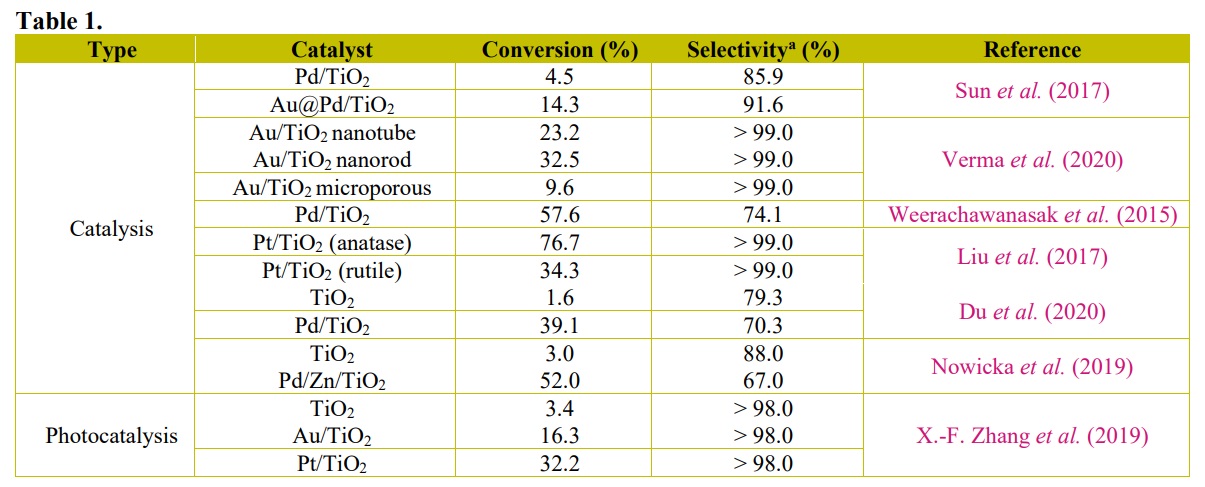 Comparing with other authors giving in Tab. 1, it is noted that TiO2 nanoparticles are used for developing several nanostructured catalysts, mainly using them with noble metals. The nanomaterial synthesized in this work presented a conversion rate and selectivity superior to other works.