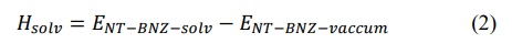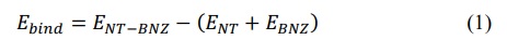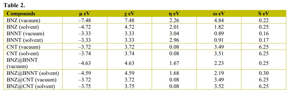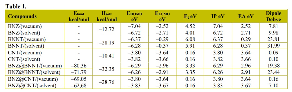 where ENT-BNZ is the total energy of the complexes (BNZ@BNNT and BNZ@CNT), considering the calculations for the vacuum and the solvent medium, ENT is the total energy of the studied nanotubes (BNNT and CNT), EBNZ is the total energy of the BNZ molecule and ENT-BNZ-solv are the total energies of the complexes obtained in the solvent and gas phases, respectively.