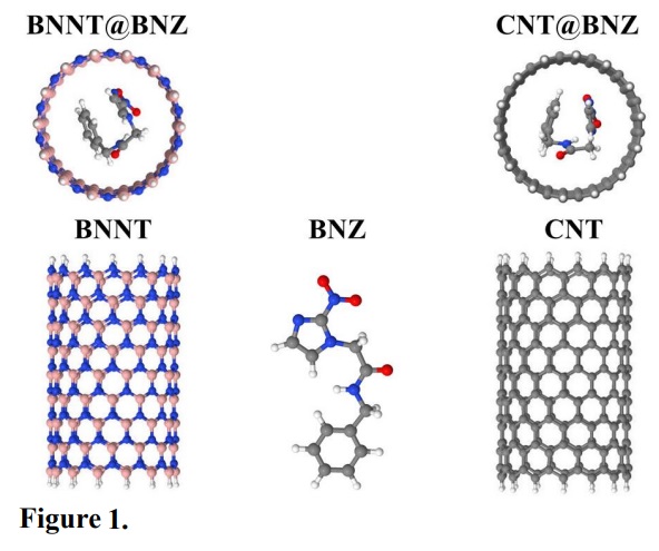 Even though carrier agents are efficient, the elaboration and development of new nanocarriers have a high experimental cost. Computational chemistry then emerges as a relatively low-cost tool to assist researchers in the optimization of experiments, reducing operating costs. In this sense, O. Oliveira and Viegas (2020), recently used computational chemistry methods to show that cucurbit[7]uryl is a possible new carrier agent of benznidazole. Carbon nanotube (CNT) is another class of nanocarriers that have been extensively studied over the past two decades. In addition to their electrical and optical properties (Rathod et al., 2019), CNTs are also inert and chemically stable (Anzar et al., 2020), which increases their potential application in drug delivery. For such reasons, CNTs have been used as drug carriers in the treatment of different diseases (Wang and Moriyam, 2011). Another nanotube of great interest is the boron nitride nanotube (BNNT). Despite having similar properties, CNTs are metallic or semiconductor, while BNNTs are electrically insulating (Kim et al., 2018). Like CNTs, BNNTs have also been widely used in drug delivery (Ciofani, 2010). Regarding the toxicity, the BNNTs are nontoxic and biocompatible, while possible cytotoxicity of CNTs have been observed (Dehaghani et al., 2020).