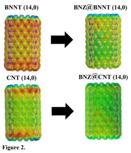 As it can be seen in Fig. 2, charge transfers can be evidenced by the modification in the MEP after the formation of the BNZ@BNNT and BNZ@CNT complexes. Therefore, according to Tabs. 1 and 2, this transfer process is very important to improve the electronic properties of the studied nanotubes.
