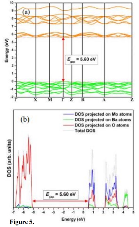 The theoretical study of the electronic properties corroborates with the UV-vis results. The theoretical model of the BaMoO4 is seen as a defect-free structure with ideal parameters. This model presented a higher Egap value (Fig. 5a) of 5.60 eV. The observed electronic transition is direct between the Γ-points of the Brillouin zone. The atomic composition of the VB and CB was investigated by analyzing the density of states (DOS) from all atoms in the structure. As shown in Fig. 5b, the VB for BaMoO. is mainly formed by the contribution of the orbitals from the O atoms, and these orbitals are mostly antibonding types. On the other hand, the CB is composed primarily by the hybridization of the orbitals from the Mo and O atoms. This region also has a contribution from the Ba atoms. There is the presence of bonding and antibonding orbitals.