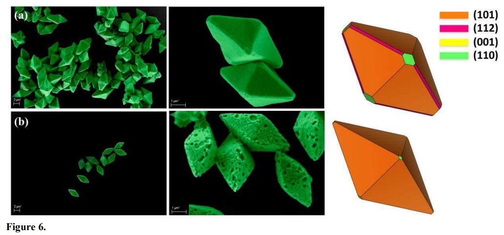 Abstract: This paper discloses the effect of the surfactant sodium dodecyl sulfate (SDS) in the morphology and the photocatalytic activity of BaMoO4 crystals. Experimental techniques were applied to study the order-disorder degree of the samples. First-principles calculations were performed at density functional theory level with the B3LYP hybrid functional. The morphologies were investigated by field emission scanning electron microscopy, and the theoretical crystal shapes were obtained through the Wulff construction. The photocatalytic activity efficiency of the BaMoO4 crystals was tested against the Rhodamine B (RhB) dye. In this paper, BaMoO4 synthesized with SDS by the coprecipitation method presented a monophasic crystal with a disordered structure. In addition, the presence of this surfactant generated pores on the surfaces of the material, and those pores were responsible for the appearance of the adsorptive ability enhancing the adsorption process of the RhB dye in the dark, in absence of ultraviolet light.