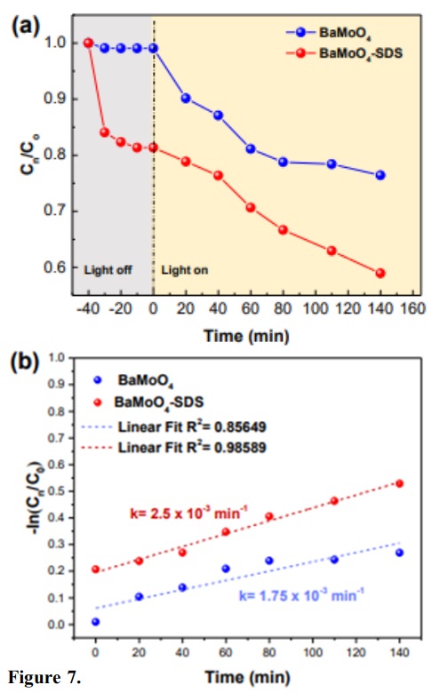 Therefore, by analyzing the degradation profile shown in Fig. 7a, it can be seen that the presence of SDS in the synthesis improved the photocatalytic activity. BaMoO4 crystals degraded about 23% in 140 min, while the degradation of the BaMoO4-SDS crystals was 45%. The process analysis showed that both degradations occur in first-order kinetics. The calculated velocity constants were k = 1.75 × 10−3 min−1 and k = 2.50 × 10−3 min−1 for the BaMoO4 and BaMoO4-SDS crystals, respectively, as shown in Fig. 7b. So, the increase in reaction kinetics indicates that BaMoO4 synthesis in the presence of SDS is favorable for materials with photocatalytic properties.