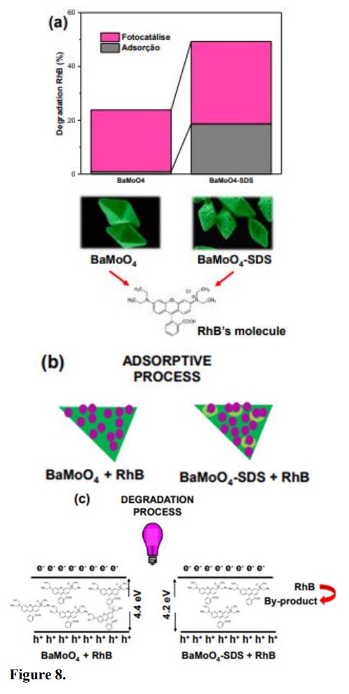 In this study, it was possible to understand how the presence of a surfactant, in this case, the SDS, can generate changes in the morphology of the BaMoO4 crystals and how this fact shifts the photocatalytic activity. In the case of BaMoO4 synthesized with SDS, the presence of this surfactant generated pores on the surface of the material’s morphology, and the presence of these pores facilitated the adsorption process of the RhB dye in the dark, without the presence of UV light, and, consequently, a new property for that semiconductor was created, the adsorptive capacity. In addition to the acquired adsorptive ability, BaMoO4 synthesized with SDS showed a photocatalytic improvement. These results demonstrate that morphology control can influence the creation of new properties, opening a range of opportunities for further studies.