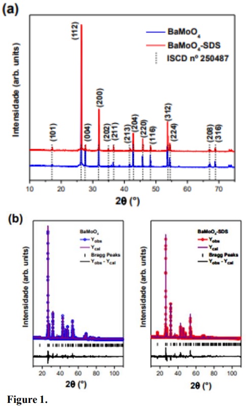 In particular, the coprecipitation method, which, according to the literature, is defined as a process for obtaining crystalline materials from the dissolution of reagents or soluble precursors in aqueous solution with or without the presence of a mineralizer (chemical bases) at relatively low temperature, has been used recently in the preparation of different molybdates of different shapes and sizes (Theiss et al., 2016). However, to obtain homogeneous and monophasic molybdate crystals by this method, higher temperatures (> 100 °C) are necessary due to the low reaction kinetics (Kianpour et al., 2013). Studies have been carried out using the coprecipitation method, employing surfactants as stabilizing agents to aid in the kinetics and, thus, reduce the reaction temperature (Kianpour et al., 2016). These surfactants act as reactants during the reaction and stabilize the colloids. The literature also shows the effect of different surfactant ratios in controlling the size of microstructures and improving photocatalytic, photoluminescent, and antibacterial properties (Ji et al., 2020; Keerthana et al., 2021; Ray et al., 2018). Among the used surfactants, the anionic sodium dodecyl sulphate (SDS) acts as a stabilizer protecting the newly formed cation or anion nuclei, which has an intrinsic preference for the growth of their crystals (Kianpour et al., 2013; Luo et al., 2010).