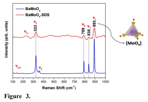 The Egap values show a slight variation between the samples. The decrease in the Egap value for the BaMoO4-SDS crystals can be attributed to a reduction in the local order degree, which may have been caused by the creation of new intermediate levels between the valence (VB) and conduction bands (CB). This fact can be attributed to the presence of the SDS surfactant during the synthesis of the material that causes distortions in the crystal structure, which endorse the experimental Raman spectra.