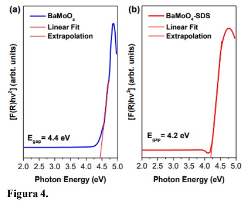 The UV-vis spectra for the BaMoO4 and BaMoO4-SDS samples made it possible to determine each .gap value, applying the Kubelka–Munk function. This function is generally applied to convert diffuse reflectance into equivalent absorption coefficient and is mainly used to analyze powder samples and is described as (Eq. 1) (Wood and Tauc, 1972):