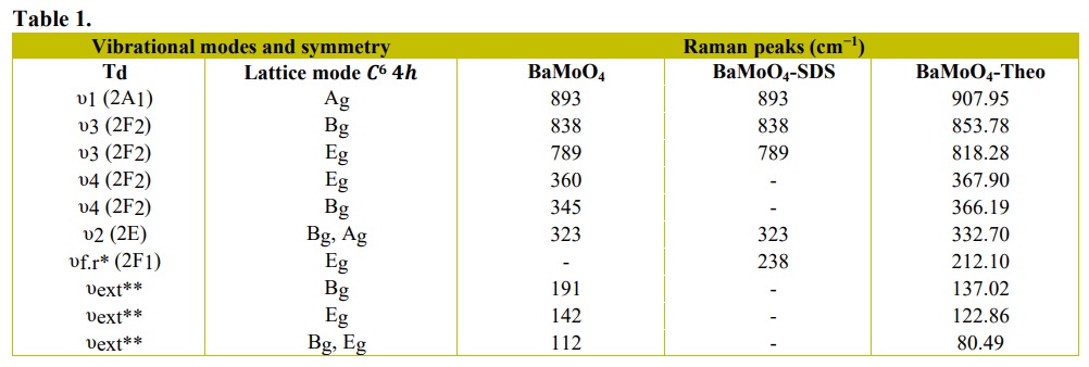 The analysis of the structural order/disorder degree of the BaMoO4 crystals at a short distance was analyzed using the micro-Raman spectra. The results can be found in Fig. 3 and in Tab. 1, compared with the theoretical modes.