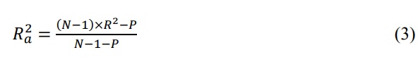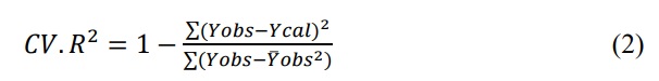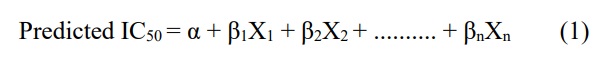 where α is the regression constant, X., X..... X. are the descriptors and β1, β.…β.are the coefficient of the corresponding descriptors. The developed QSAR model was validated by considering series of statistic factors such cross validation R2 (CV.R2 ) and Adjusted R2(R2a) (Eqs. 2 and 3) and the developed model will be considered valid when the calculated value for R2a and CV.R2 were ≥ 0.6 and ≥ 0.5 respectively.