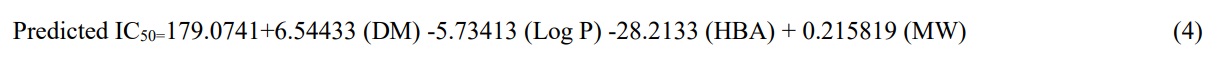 Fathy et al. (2020)The obtained descriptors were extracted from the optimized compounds together and were used in developing valid and reliable QSAR model. The extracted descriptors were used as independent variable and the experimental inhibition concentration (IC50) was used as dependent variable. The QSAR model development was achieved using genetic function approximation (GFA) via material studio software (Puzyn et al., 2010) and the MLR-GFA equation for the model is shown in Eq. 1 below: