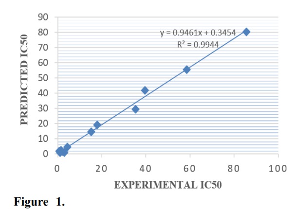 Five distinct models were developed and the best model was chosen and reported among them, since it met the minimum conditions for the evaluation of a valid QSAR model, as reported by Veerasamy et al. (2011). Tables 2–5 as well as Figs. 1 and 2 present the findings of the QSAR study and the developed QSAR model was presented in Eq. 4. The selected and reported model is given by the Eq. 4 with the following validation terms: R. = 0.9525, adj.R. = 0.9314 and CV.R. = 0.9719.