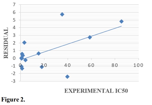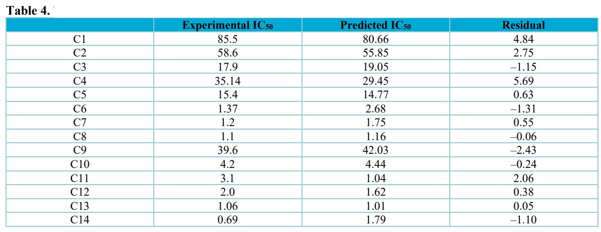 For the compounds under examination, Table 4 displays the experimental IC50, predicted IC50, and residual values. The minimal residual values observed between the experimental and predicted IC50 in the table validated the model’s high anticipated power (meaning that the reported model was reliable with high predicted power). Figure 1 also shows a plot of the predicted IC50versus experimental IC50 for the compounds, and the distribution of the predicted IC50 and experimental IC50 of the compounds along the line reaffirmed the model’s dependability. The R2 values of the internal validation (0.9525) and the plot (0.9944) agreed with one another, confirming the reported model’s stability and reliability (Grisoni et al., 2018). Furthermore, Fig. 2 shows a scatter plot of residuals against the experimental IC50 which the remarkable appearance of both sets of residuals on the plot's top and lower sides confirms that the reported model was free of methodological mistake (systematic deviations).