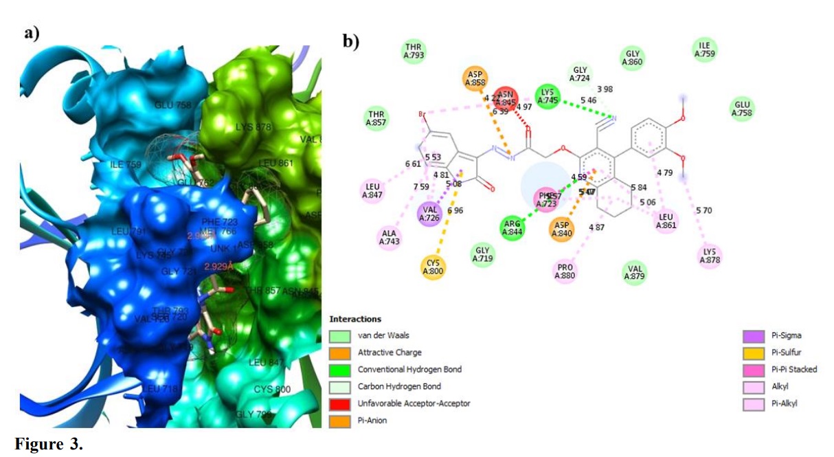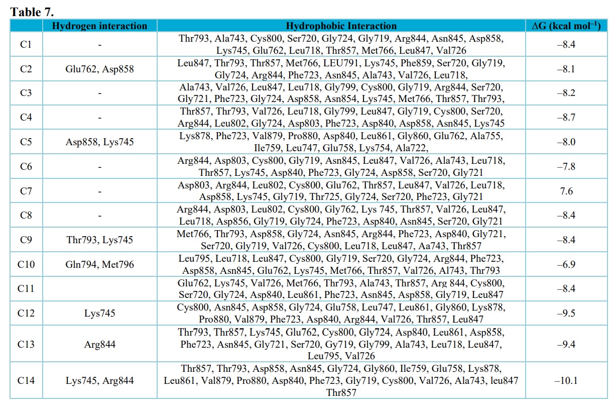 Molecular docking technique was used to recognize the compounds which bind well to the EGFR pocket. All tested compounds had strong binding affinity with the receptor. They perfectly fit into the active site of the receptor by interacting with the amino acid residue in the active site of the receptor. The protein residues involved in the interaction, types of interaction involved, distance and binding affinity obtained for each complex formed by the studied compounds and standard were displayed in Tables 7 and 8. The protein residues involved in the interaction and type of interactions observed for C14-EFGR complex was also displayed in Fig. 3.