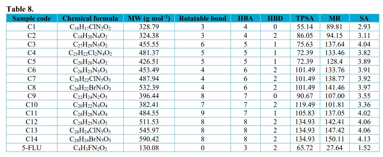 Drug-likeness analysis is a qualitative evaluation of oral bioavailability based on structural or physicochemical examination of molecules. In this study the rule base filters which include Lipinski’s et al. (2013), Veber et al. (2002), and Muegge and Ghose (2001) rules were employed to determine if a molecule is impermeable or badly absorbed. If a molecule does not break more than two rules, it is deemed orally bioavailable. As indicated on Table 8, the molecular weights of the compounds range from 130 (5-FU) to 590 g mol–1 (C14). The HBA ranged from 3 to 8 and HBDs ranged from 0 to 2; number of rotatable bonds are between 0 (5-FU) to 9 (C11). The TPSA are between 55.14 (5-FU) and 134.93 (C13 and C14). MR ranged from 27.64 (5-FU) to 150.11 (C14). The less the drug candidate can infiltrate, the higher the TPSA and molecular weight values are, and vice versa.