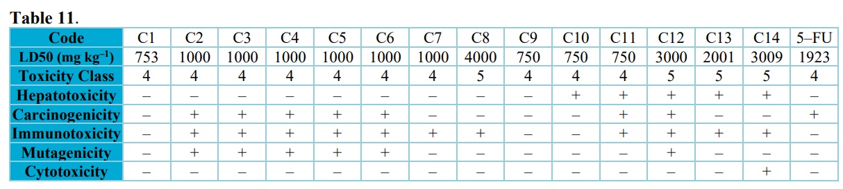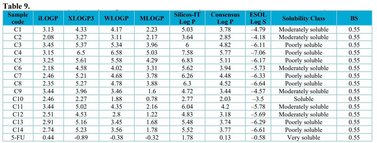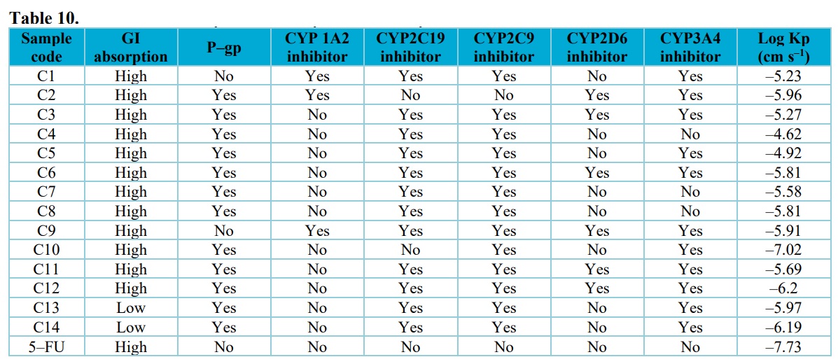 The enzyme cytochrome P450 monooxygenase plays an important role in the metabolism and removal of drugs. It is a group of isoenzymes that catalyzes several processes in the first phase of drug metabolism (Hollenberg, 2002). The suppression of five main isoforms (CYP1A2, CYP2C19, CYP2C9, CYP2D6, and CYP3A4), which are substrates of 50–90% of medications and primary sources of pharmacokinetics-related drug-drug interactions. Because these enzymes are not inhibited, the chemicals have a high chance of being converted and, as a result, of becoming bioavailable when taken orally. Inhibition of the CYP isomers by the substances, on the other hand, can result in poor bioavailability due to failure to be metabolized and severe side effects due to their retention (Sahin and Benet, 2008). Compounds C1, C2, and C9 are potential inhibitor of CYP1A2 among the tested compounds. All the compounds are potential inhibitor of CYP2C19 except compound C2, C10, and standard 5-FU. As shown in table 10, only compound C2 and 5-FU (referenced drug) were non-inhibitors of CYP2C9 while other studied compounds proved to possess the ability to inhibit CYP2C19. Compounds C1, C2, C3, C6, C9, and C12 are potential inhibitor of CYP2D6 while others are not. All compounds are potential inhibitors of CYP3A4, except compounds C4, C7, C8, 5-FU. It was observed that the standard 5-FU was is not an inhibitor of any cytochrome P450, which suggests that the standard is more likely to be converted and bioavailable after oral delivery than the compounds investigated.
