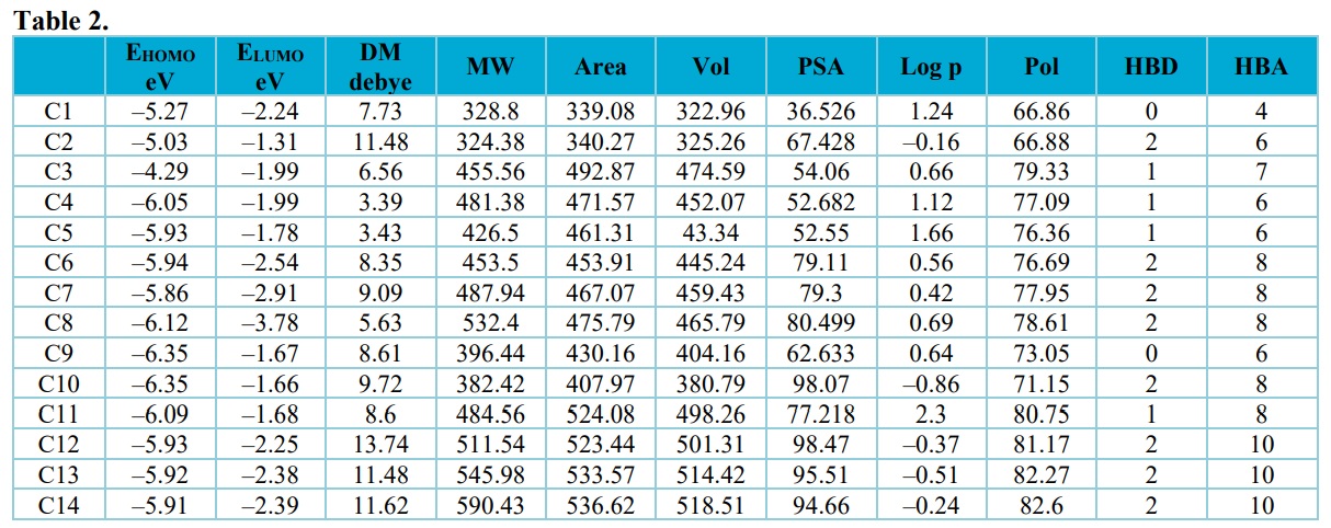 The calculated descriptors from optimized compounds were screened and for further processing. The calculated descriptors were the energy of the highest occupied molecular orbital (EHOMO), lowest unoccupied molecular orbital energy (ELUMO), dipole moment (DM), volume, area, lipophilicity (log P), polar surface area (PSA), number of hydrogen bond donor (HBD), hydrogen bond acceptor (HBA). The calculated descriptors also helped in QSAR study. As shown in Table 2, C3 possess higher EHOMO value and according to report by Semire et al. (2017), compound with high EHOMO value possess greater tendency to donate electron to the neighboring compounds and it is expected to interact with the target; therefore, C3 with –4.29 eV is expected to interact well with neighboring compounds. As reported by Oyebamiji et al. (2018), the lower the ELUMO value the better the tendency of the compound to interact with the target; therefore, C8 proved to have a tendency to interact than other studied compounds (Table 2).