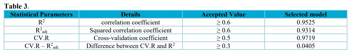 Also, as reported by Oyebamiji et al. (2021), inhibition concentration of any developed QSAR model is not enough to judge the potency of such model and this therefore called for validation of the developed QSAR model. The calculated factors considered for validation were cross validation (CV.R2) and adjusted squared correlation coefficient (adj.R2).
