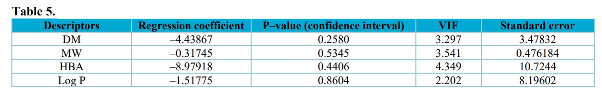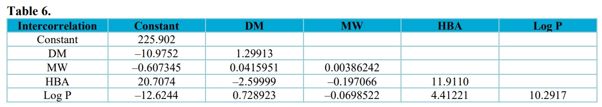 Table 6 shows the correlation statistical analysis of the independent descriptors in the presented model, which revealed that there is no relationship between the descriptors in the model. This demonstrated the good performance of the descriptors utilized in creating the reported model.