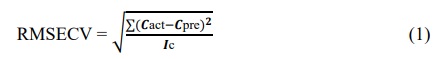 where RMSECV = Root mean square error of cross validation; Cact = Actual concentration of calibration set; Cpre = predicted concentration of calibration set; and Ic = Total number of samples in calibration set.