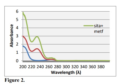 In order to choose a suitable solvent, solubility was checked in water, methanol, 0.1 mol L–1 NaOH and 0.1 mol L–1 HCl. The drug was found to be soluble in methanol, water, 0.1 mol L–1 NaOH and 0.1 mol L–1 HCl. Therefore, water was selected as diluent that has striking advantages such as easily available, easy to handle, a cheap and environmentally friendly for implementing the spectrophotometric method and Fig. 2 showed the spectra of the sitagliptin and metformin hydrochloride in water.