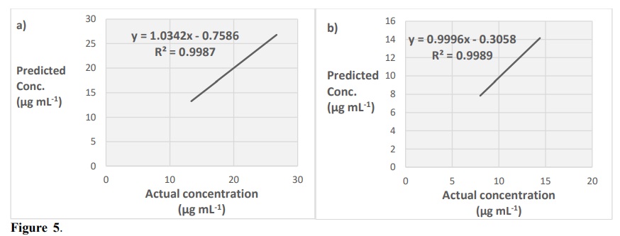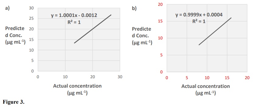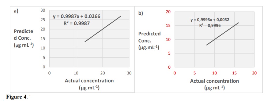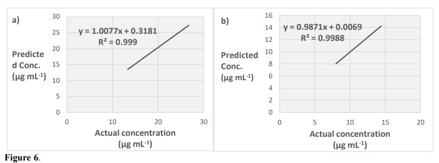 In order to validate and assess the performance of the suggested and developed spectrophotometric methods assisted chemometric models, these methods were subjected to validation set. Also, the performance criteria of the developed methods including linearity, accuracy, precision (repeatability) and specificity were validated in accordance with the recommendations of International Conference Harmonization and after that determined.