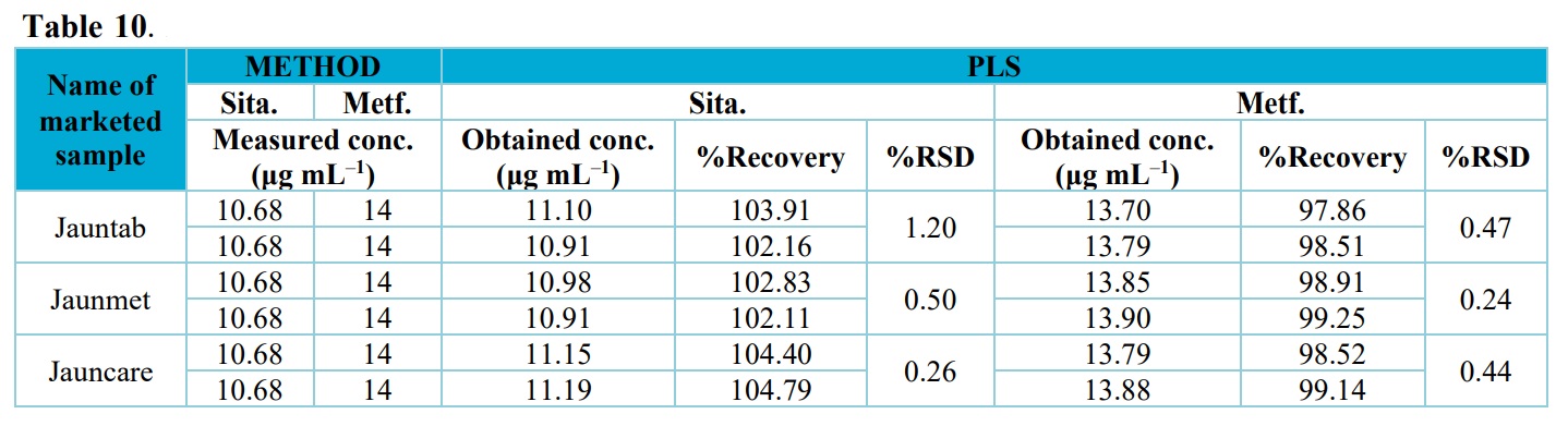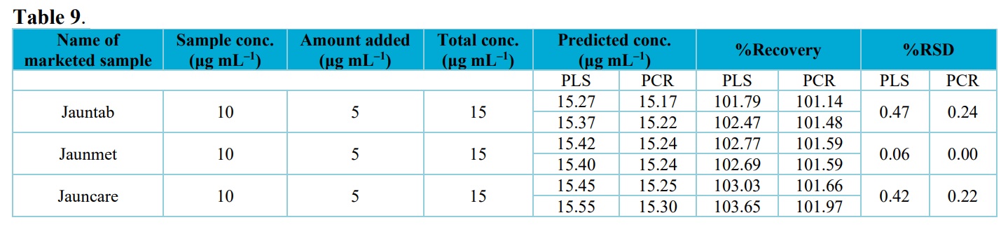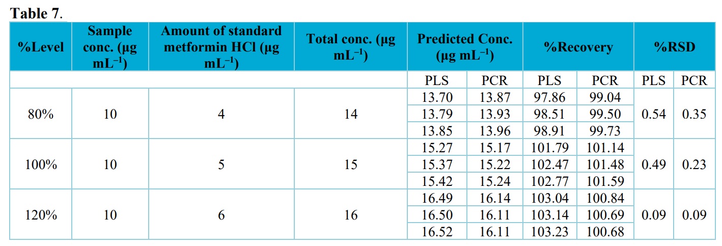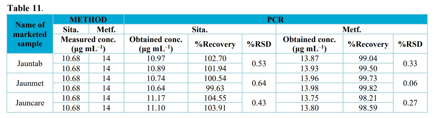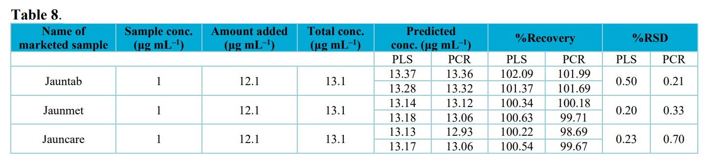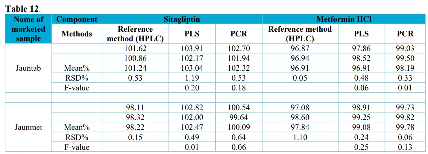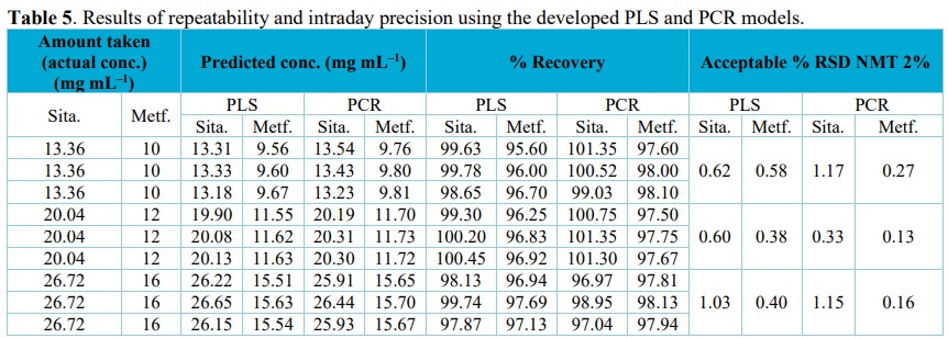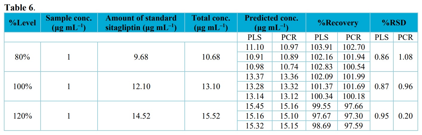 As it can be appeared from these data, recovery for sitagliptin and metformin hydrochloride using the developed PCR and PLS models are within the acceptable limit (90–110%) This suggests that the methods are free from interference due to the excipients used in the commercial formulation.