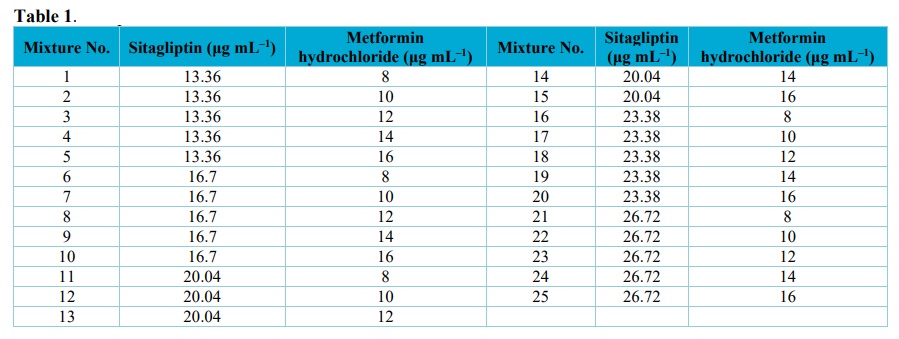 A set of twelve binary mixtures of sitagliptin and metformin hydrochloride was prepared by transferring different volumes into 50 mL volumetric flasks and the procedure under the construction of the training set was repeated.