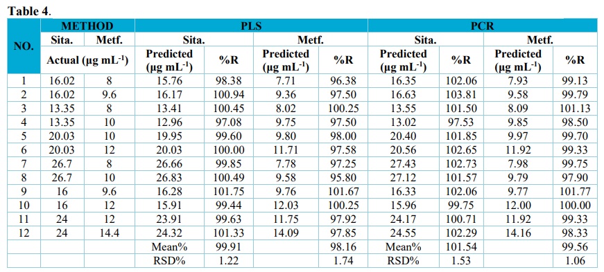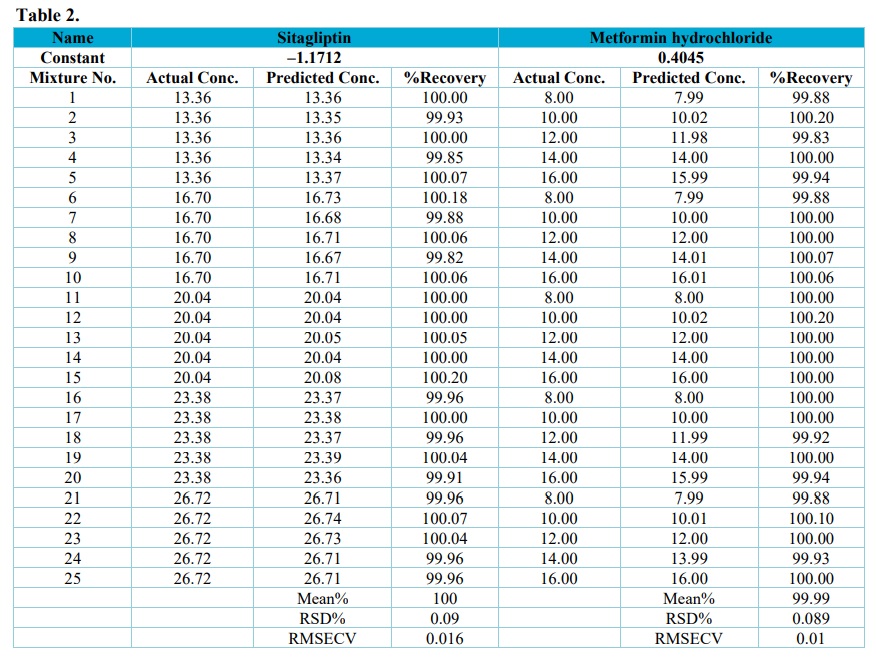 The predicted or calculated concentrations of the components were compared with the actual concentrations and the assay of binary mixture were calculated. RMSECV was calculated and found to be low. The low values of RMSECV in Table 2 indicate both the precision and accuracy of PLS model for sitagliptin and metformin hydrochloride were very high and the R. values in Fig. 3 were also of very high linearity.