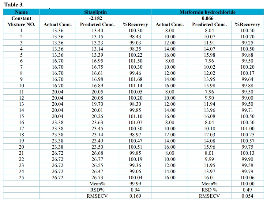 The predicted or calculated concentrations of the sitagliptin and metformin hydrochloride were compared with the actual concentrations and the assay for binary mixture were calculated in each sample. RMSECV was calculated and found to be low. The RMSECV low values in Table 3 indicate that both the precision and accuracy of PCR model for sitagliptin and metformin hydrochloride were very high, with the R. values in Fig. 4 of very high linearity.