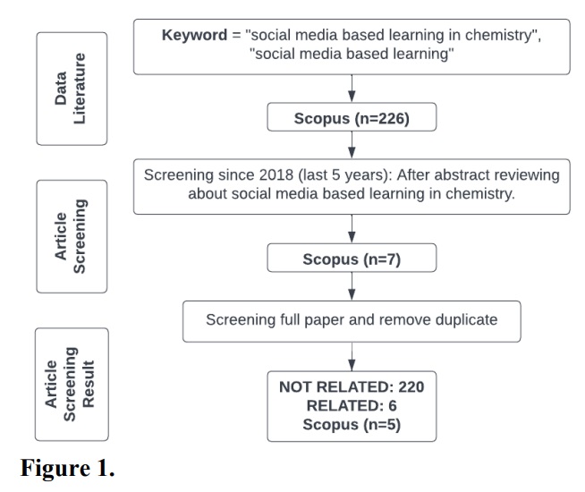 In this study, the data used with the keyword “social media-based learning in chemistry” with a journal publication time span of 2018–2022 (last 5 years). After the application was run, the researcher read the title and abstract of the article to select articles that met the following inclusion criteria: 1) Articles about social media-based learning in chemistry learning; 2) Publication of reputable, accredited, and full-text articles. This study has exclusion criteria, namely articles not related to social media-based learning in chemistry learning as well as articles published before 2018.