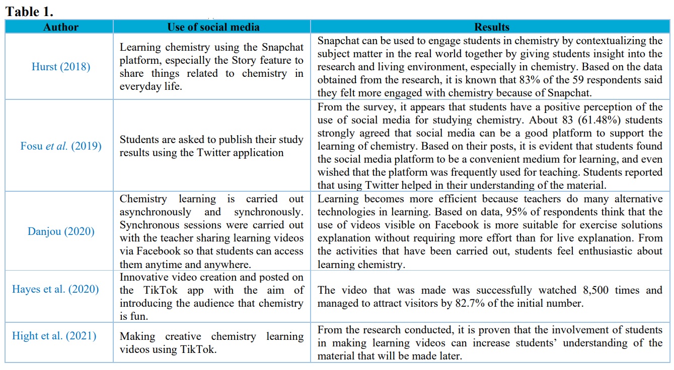 Literature study information in terms of abstracts, background, research questions, objectives, methods, and research results are presented in Table 1. Of the 5 articles reviewed, 1 article was published in 2018, 1 article was published in 2019, 2 articles were published in 2020, and 1 article was published in 2021. The following chemistry learning materials that can be applied to social media-based learning can also be seen in Table 1.