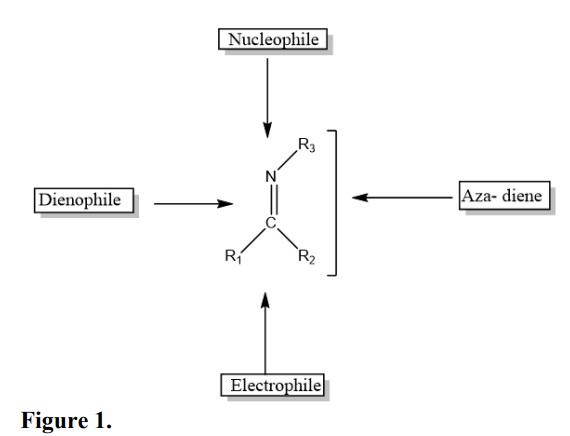 In recent years, imines have been the millstone of chemist research because they were easy to prepare and get various reactions. They can be prepared simply by the reaction of primary amines with carbonyl compound (usually aldehydes or ketones) in the presence of acid as catalyst. The functional group of these compounds is azomethane group C=N. Due to the electronegativity of the nitrogen atom, this group has four different reactions. Firstly, electrophilic, secondly nucleophilic, thirdly dienophile, and lastly, aza-diene reaction (Fig. 1) (Choudhury and Parvin, 2011).