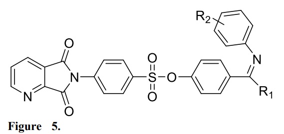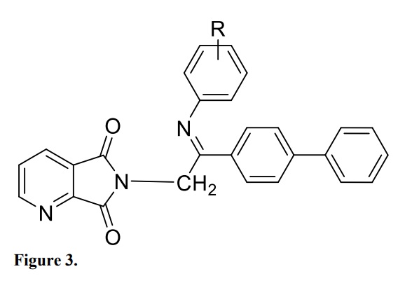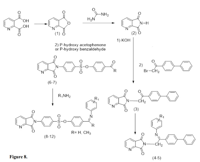 Abstract: In this paper, some substituted imines compounds have been prepared from quinolinic acid as a starting material. Firstly, the quinolinic acid was treated with acetic anhydride and acetic acid to form furo[3,4-b]pyridine-5,7-dione (1); the resulting compound was heated with urea to form 5H-pyrrolo[3,4-b]pyridine-5,7(6H)-dione (2). After that, it was treated with potassium hydroxide to give potassium 5,7-dioxo-5,7-dihydropyrrolo[3,4-b]pyridin-6-dione, which was directly and easily converted to 6-(2-([1,1'-biphenyl]-4-yl)-2-oxoethyl)-5H-pyrrolo[3,4-b]pyridine-5,7(6H)-dione (3) by the reaction with 1-([1,1'-biphenyl]-4-yl)-2-bromoethan-1-one. Finally, the resultant compound reacted with substituted aniline to give imines (4, 5). Secondly the quinolinic acid converted to 4-(5,7-dioxo-5,7-dihydro-6H-pyrrolo[3,4-b] pyridin-6-yl) benzenesulfonyl chloride according to our previous work, then treated with p-hydroxy acetophenone or p-hydroxy benzaldehyde to form 4-substituted bezyloxy 4-(5,7-dioxo-5,7-dihydro-6H-pyrrolo[3,4-b] pyridine-6-yl) benzenesulfonate (6, 7), which were finally treated with substituted aniline to form new substituted imines (8–12).