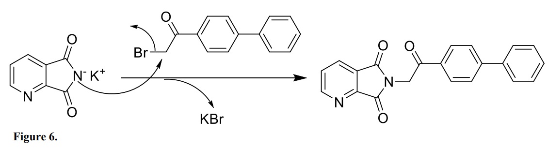 Compound (3) was prepared in two steps. Firstly, compound (2) was treated with alcoholic potassium hydroxide to form organic salt to increase the nucleophilicity to react with 4-phenyl phenacyl bromide via one step SN2 mechanism (Fig. 6). The resultant compound was confirmed by physical properties as a brown powder resulting in 60% (m.p. 120–124 °C), IR 3104 cm–1 for aromatic C-H, 1715 cm–1 for amid carbonyl, 1680 cm–1 for ketonic. In addition, 1HNMR δ chart gave signals at 8.21–7.32 (m, 12) and at 4.95 singlet belongs to two protons for CH2 (Maimaris et al., 2022).