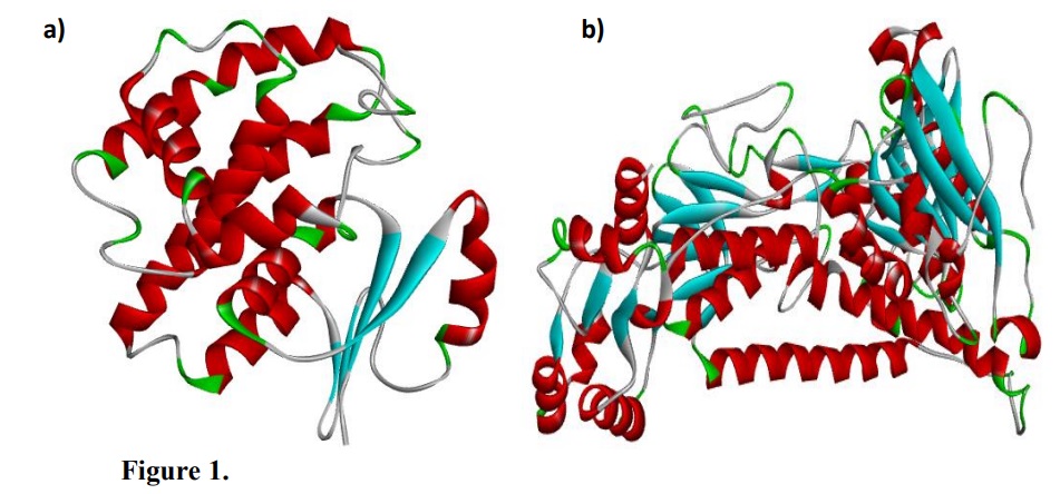 Two targets (glutathione S-transferase [PDB ID: 1gtb]) (McTigue et al., 1995) and thioredoxin-glutathione reductase (PDB ID: 3h4k) (Angelucci et al., 2009) were retrieved from protein data bank (Fig. 1a and b). The two receptors were subjected to Pymol software where suitable implements were deployed to treat and prepare glutathione S-transferase (PDB ID: 1gtb) and thioredoxin-glutathione reductase (PDB ID: 3h4k) for docking. The amino acids present in each of the downloaded receptor were carefully checked and any other materials (i.e., crystallographic water and small molecules rooted in each of the receptor) different from amino acids were deleted and saved in *.pdb format. Also, all the possible missing amino acids in each clean receptor were replaced using Swiss Pdbviewer 4.1.0 version and saved in *.pdb format before identification of the binding site in each receptor using Autodock tool software. The center and size in X, Y and Z directions which show the located binding site for glutathione S-transferase (PDB ID: 1gtb) were 11.97, 45.043 and 32.999 for the center and 50, 52 and 60 for size; and for thioredoxin-glutathione reductase (PDB ID: 3h4k) were 45.78, –0.593 and 16.04 for the center and 80, 90 and 78 for size. The calculation of binding affinity for the studied complex was executed via Autodock vina software and the discovery studio was used to view the interaction between the ligands and the receptors.