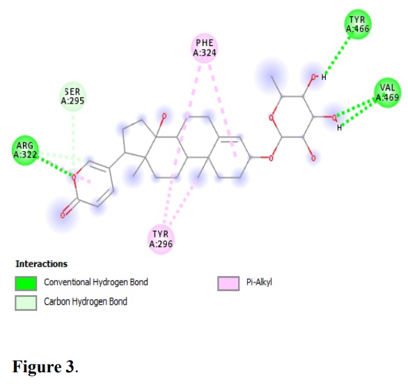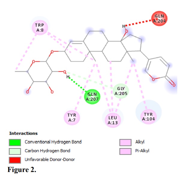 The study of pharmacokinetics plays a crucial role in drug design and discovery since only chemical compounds with worthy drug-likeness features, as well as outstanding absorption, distribution, metabolism, excretion, and toxicity (ADMET) profiles move into the advance stage of drug production (Lawal et al., 2021). Therefore, 5-[(3S,8R,9S,10R,13R,14S,17R)-14-hydroxy-10,13-dimethyl-3-(3,4,5-trihydroxy-6-methyloxan-2-yl)oxy-1,2,3,6,7,8,9,11,12,15,16,17-dodecahydrocyclopenta[a]phenanthren-17-yl]pyran-2-one (9) with lower binding affinity value, which indicate better inhibitory activities, was reconnoitered for ADMET study via ADMETlab (https://admetmesh.scbdd.com/), an online ADMET software.