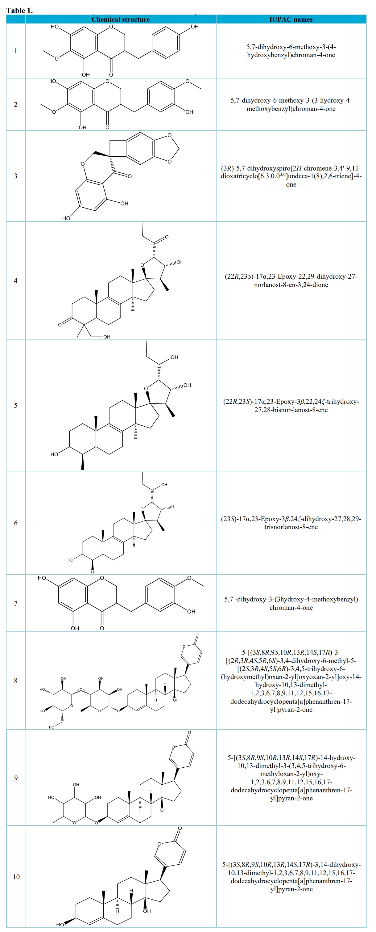 Therefore, the main purpose of this work is to (i) explore theoretical biological features of the selected phytochemicals obtained from S. natalensis, (ii) investigate the calculated binding affinity between the selected phytochemicals and the targets, and (iii) theoretically explore the pharmacokinetics of the selected phytochemicals.